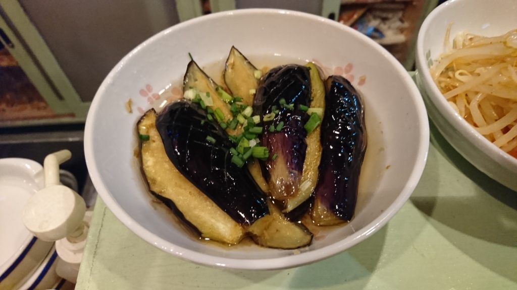 茄子の煮びたし…素揚げした茄子に、だし醤油と白湯(5:1)でつくったところに浸して出来上がりです。